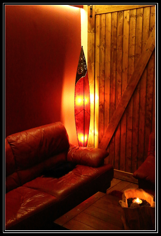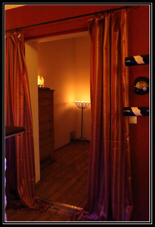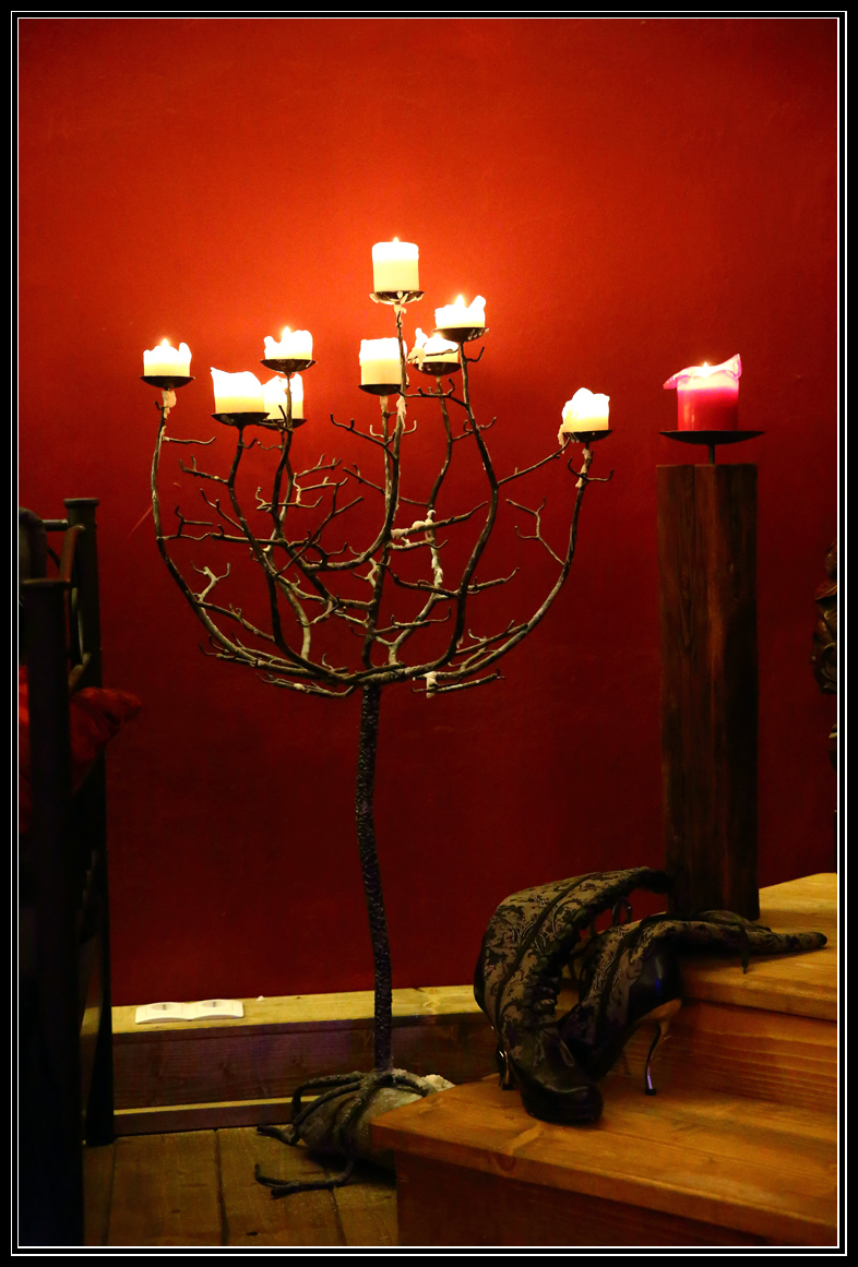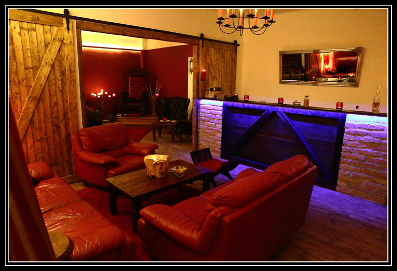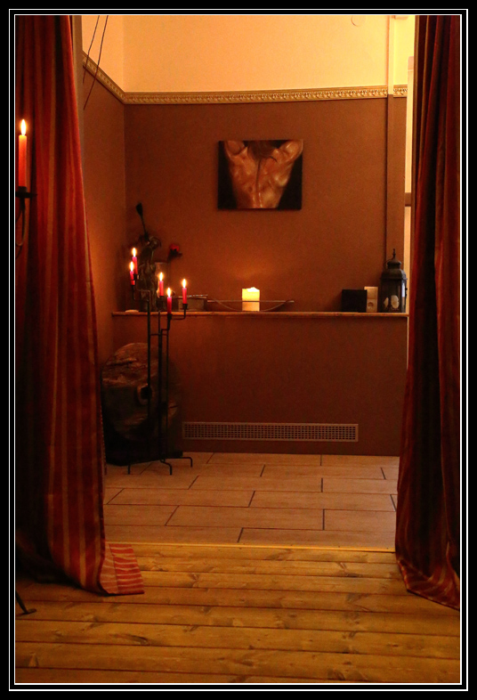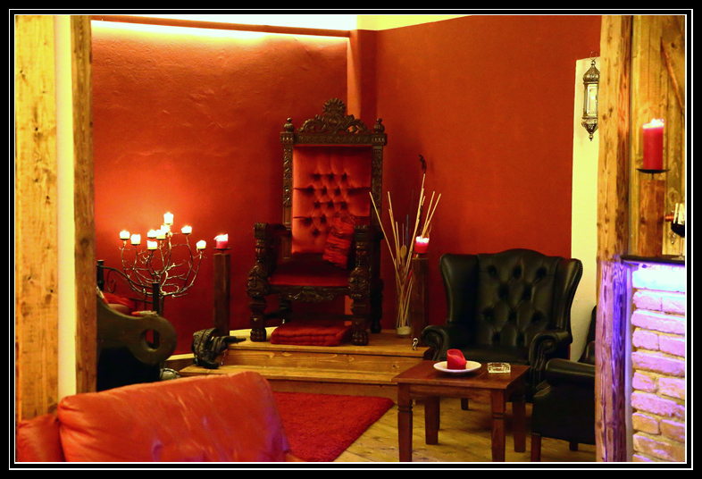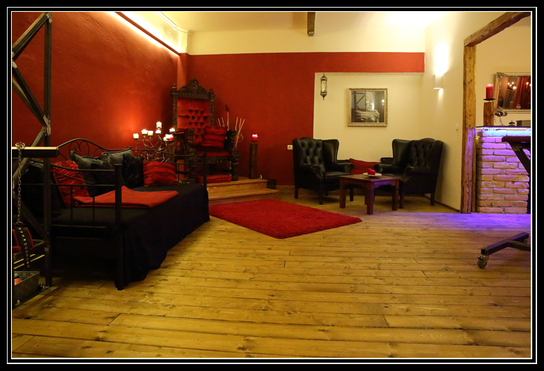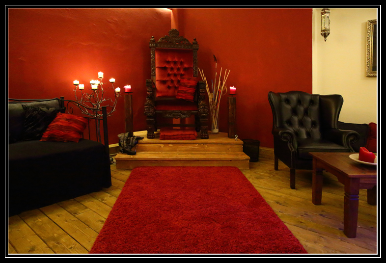 Die große Flügeltür führt vom Barbereich in den Salon. Auch dieser ist in sinnlichen Rottönen gehalten, mit vielen wunderschönen Kandelabern ausgestattet, die mit ihrem sanften Kerzenlicht. zum Spiel einladen. Den Raum beherrscht ein imposanter Thron aus edlem Holz und rotem Samt und die „Herrnsessel“ aus Leder haben schon so manche Sub ehrfurchtsvoll vor sich knien sehen.....