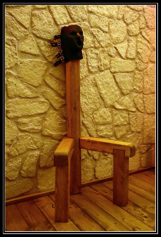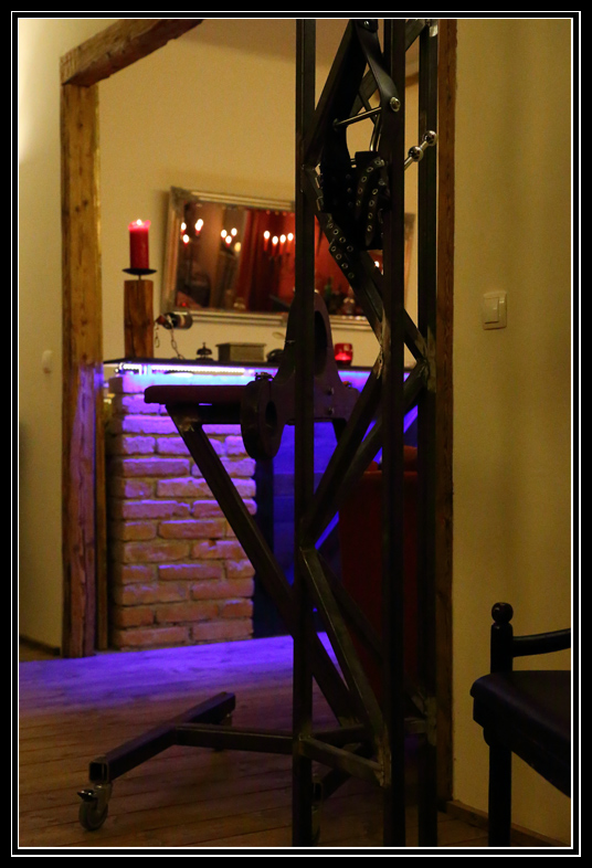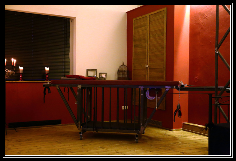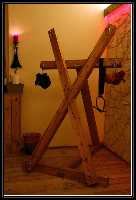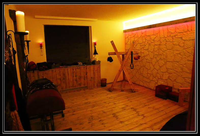 Holz und Stein, Ketten und Karabiner, Peitschen und Lederfesseln beherrschen diesen Raum, der nach Strafe und Disziplin schreit. Ob du die Minuten am Andreaskreuz zählst, oder über den Bock geworfen die längst fälligen Schläge erwartest - dieser Raum hat kein Erbarmen, deine Herrin oder dein Herr bestimmen über deinen Schmerz und deine Lust und so manch Seufzer haben sich schon in diesen Wänden verewigt!