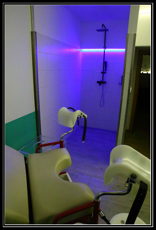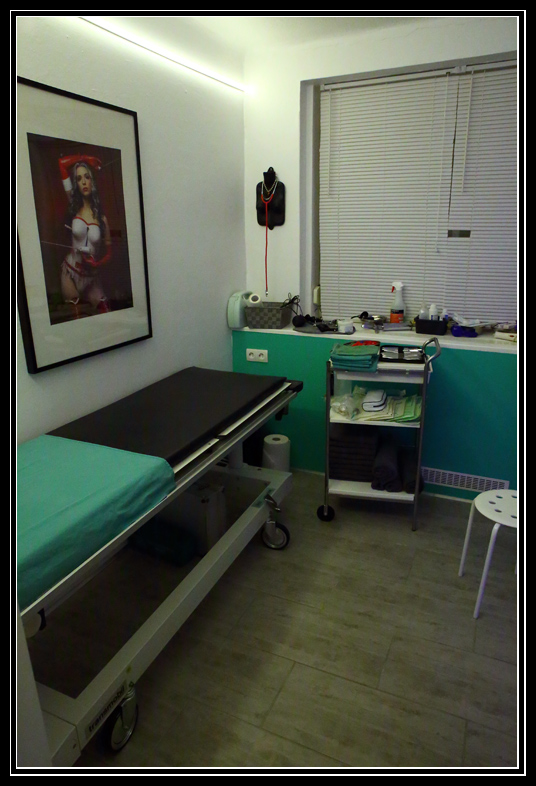 Blaues Licht scheint durch die milchige Scheibe der Schiebetür, ein Fliesenboden empfängt deine nackten Füße und vor dir tut sich das Reich der bizarren Klinik-Erotik auf. Von der medizinischen Liege bis zum Untersuchungsstuhl findest du hier alles was das Spiel im weißen Bereich so prickelnd werden lässt. Eine großzügige offene Dusche bringt NS –Fans auf dumme Gedanken und ein flauschiger Bademantel umhüllt dich zum Abschluss und holt dich sanft und warm zurück ins Hier und Jetzt!